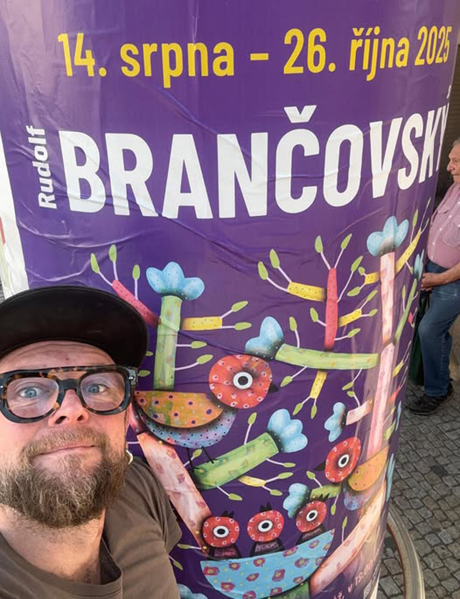 TÁBOR – Brněnský rodák Rudolf Brančovský (1980) získal genetickou výbavu pro výtvarné umění od rodičů – maminky Vlasty Švejdové, známé ilustrátorky, grafičky, malířky a karikaturistky, otce Rudi Lorenze, malíře, sochaře, též autora písniček. Charakteristický výtvarný rukopis Brančovského se vyznačuje minimalismem, plošnou barvou a lehkým humorem. Vyzkoušel řadu technik, pracoval hodně s olejem, poté se přiklonil k akvarelu. „Mám vlastní jazyk, který dlouhá léta cvičím a vyvíjím. Stoupnu si před plátno a řeknu svou řečí KRÁVA a hle ona vyskočí a je tam. Pak si řeknu, mohla by mít na hlavě klobouk a hrát na harmoniku a stane se,“ říká umělec, jenž si aktuálně našel cestu na český jih.