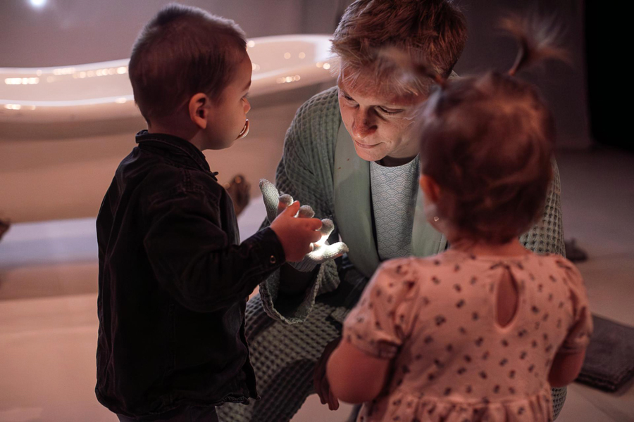Zhruba čtyřicetiminutová relaxace v divadelně lázeňském prostředí nabízí jemný smyslový zážitek, podněcovaný hudbou, světlem, barvami, pohybem a jednoduchými vizuálními podněty. „Tento tvar počítá s přirozenou reakcí malých účastníků,“ připomíná umělecký šéf David Košťák. Nevadí, když děti zapláčou, nechají se nakojit nebo zvolí spravedlivý spánek. První setkání s uměleckým prostředím může každopádně poskytnout důležitý impuls k rozvoji fantazie, vnímání i vztahu ke kultuře. „Improvizujeme. Vždy záleží na skladbě publika. Děti byly i součástí zkoušek. Stalo se, že ležící miminko v závěru zkoušky poprvé v životě začalo lézt,“ usmívá se režisérka.