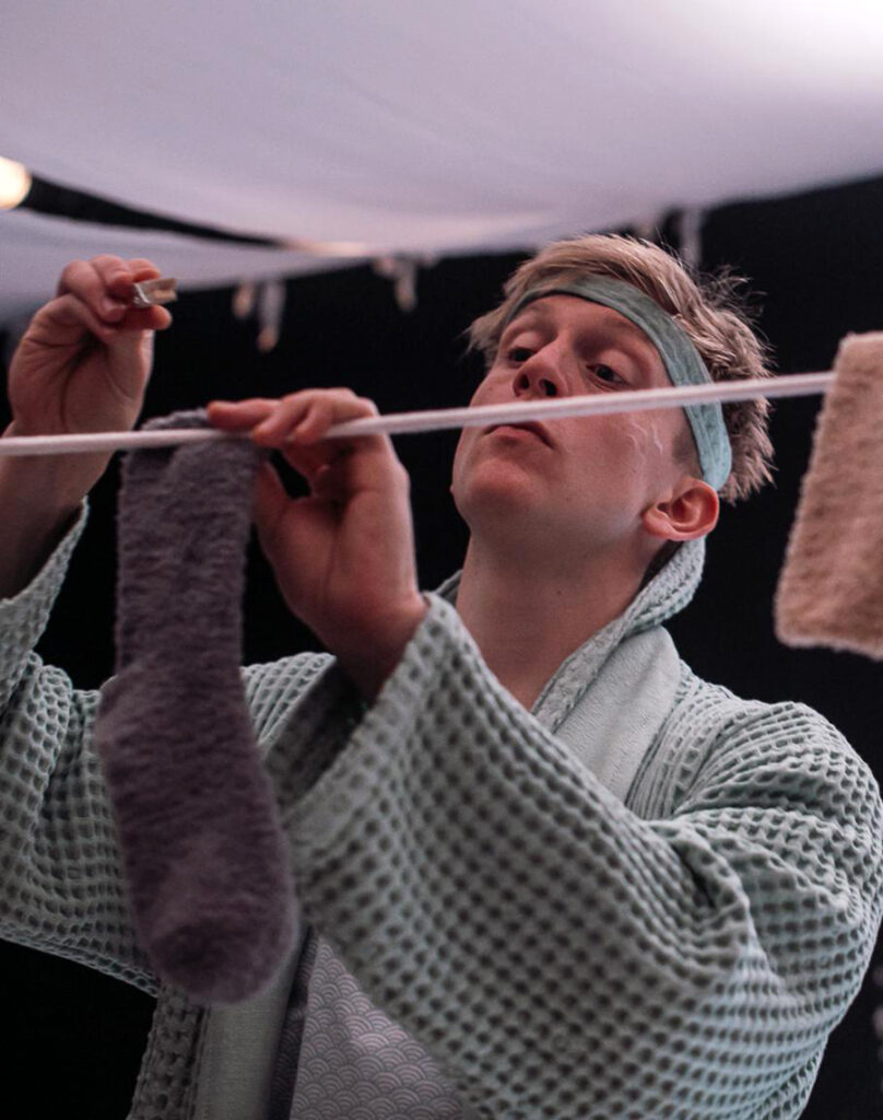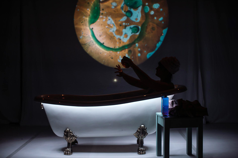 Č. BUDĚJOVICE – Láznění připravil tvůrčí tým ve složení Dana Račková (režie), Malgorzata Chodyna (dramaturgie), Anna Fukátková (výprava) a Václav Hoskovec (hudba). Nejedná se o klasickou inscenaci s prostorem rozděleným na jeviště a hlediště. Příchozí se uvelebí do měkkých polštářů na zemi nebo obsadí stupně v hledišti, jak jenom libo. Dětem nikdo nepřikazuje, aby setrvaly na místě. Naopak. Mohou se pohybovat po dvou či po čtyřech podle chuti a zájmu o lázeňské předměty, což využívají hlavně divočejší kluci. Ale připojují se i zvědavé holčičky. Neodvíjí se žádný příběh. Herci beze slov napouštějí vanu, simulují koupel, v použité vodě perou ponožky, suší prádlo na šňůře.